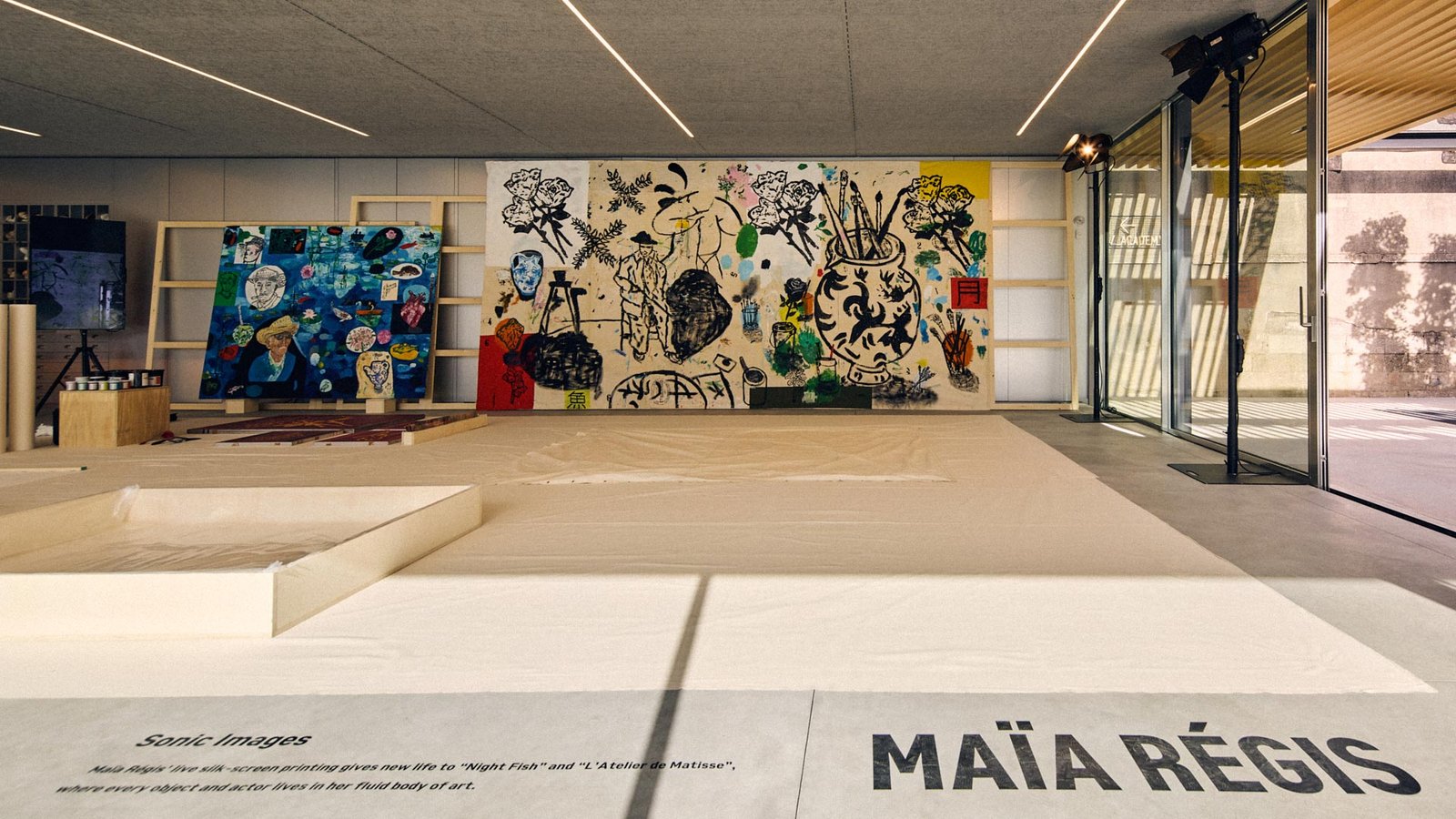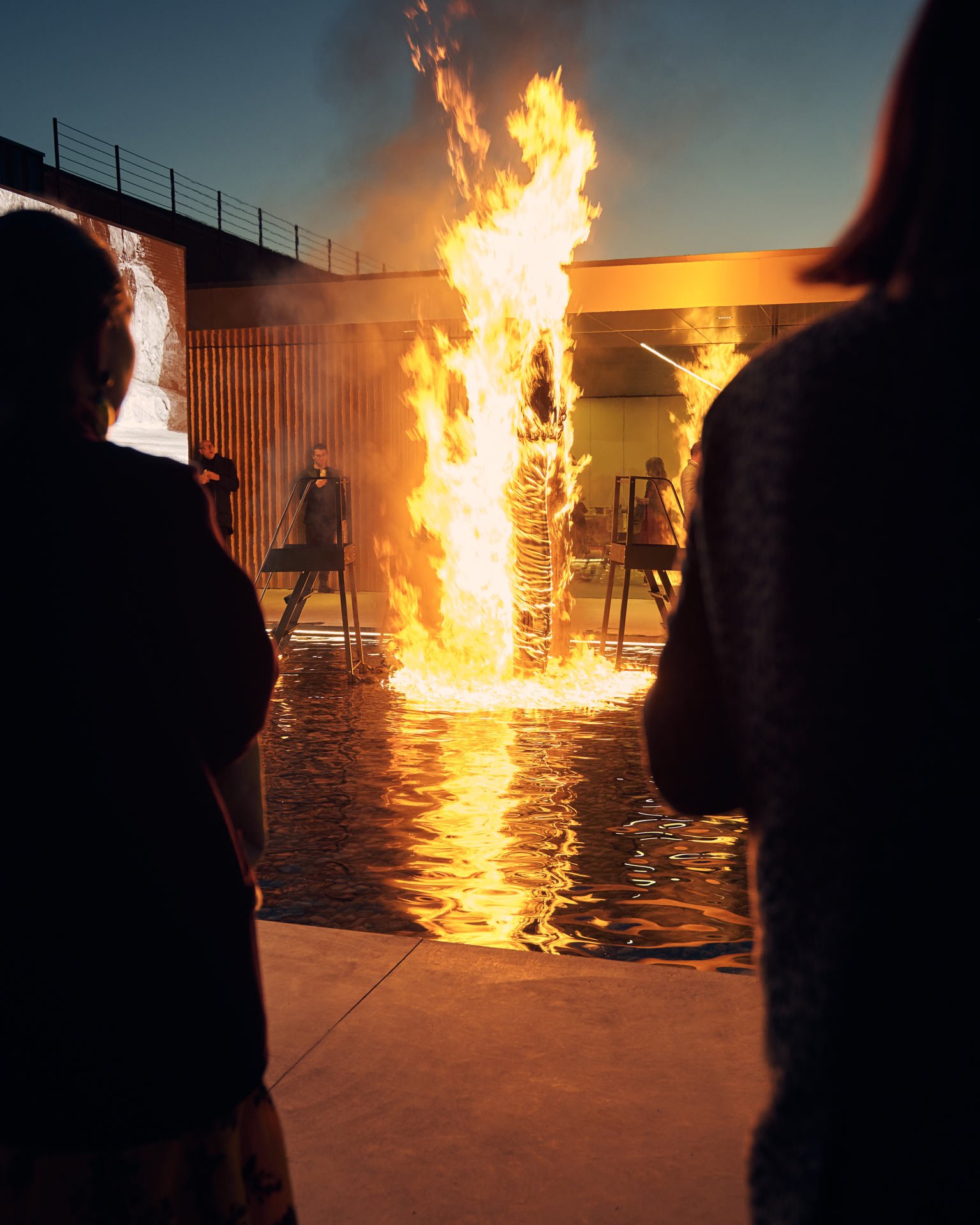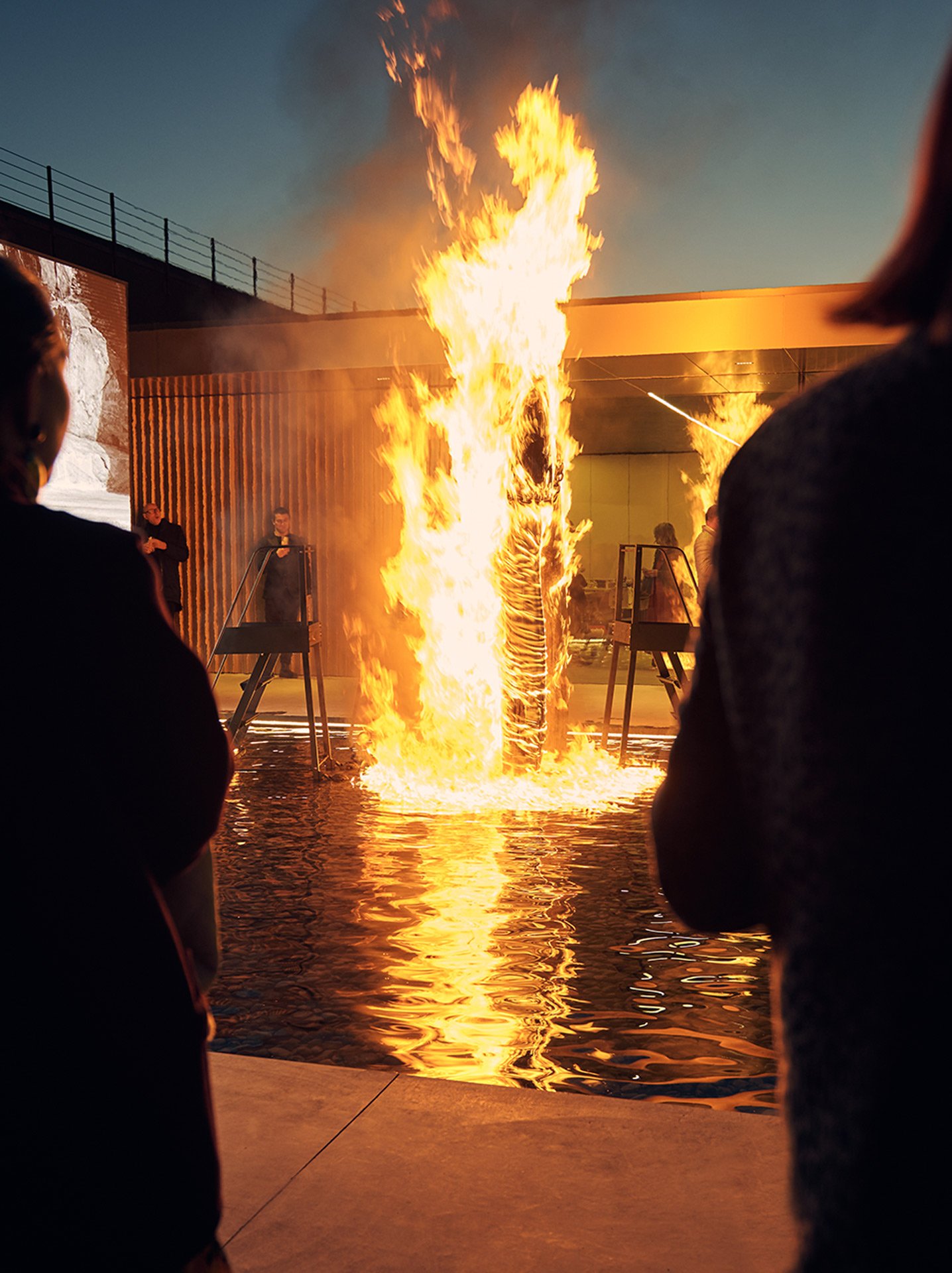 To celebrate the opening of HAUS, Golden Goose brought together four multifaceted artists from different disciplines. Argentinian visual artist Andrés Reisinger redesigned the original structure of the brand's first headquarters with its ever-present pink drapes, evoking the curtains separating the stalls and wings of a theatre. A sort of invitation to unveil the mystery behind the history of this brand. During the opening, outside, Italian sculptor Fabio Viale transformed marble columns into typical Venetian briccole (the wooden poles used in Venice to indicate navigable routes and canals). These sculptures were then set on fire in front of the public, so as to reflect on the fragility and risks to the city of Venice. Inside, in the Academy, those who wished could participate in the live-performance of the French-Italian painter Maïa Régis, who was engaged in the creation of large coloured canvases using the silk-screen printing technique. Through this practice, the artist highlighted the contrast with the 'mass-produced' works typical of industrial areas, emphasising the uniqueness of each handmade piece. Finally, in the Auditorium, guests experienced a unique moment with the young singer Mia Lailani. Her performance was amplified by experimental beats and hypnotic visuals, filling HAUS with sounds, stories and dreams.