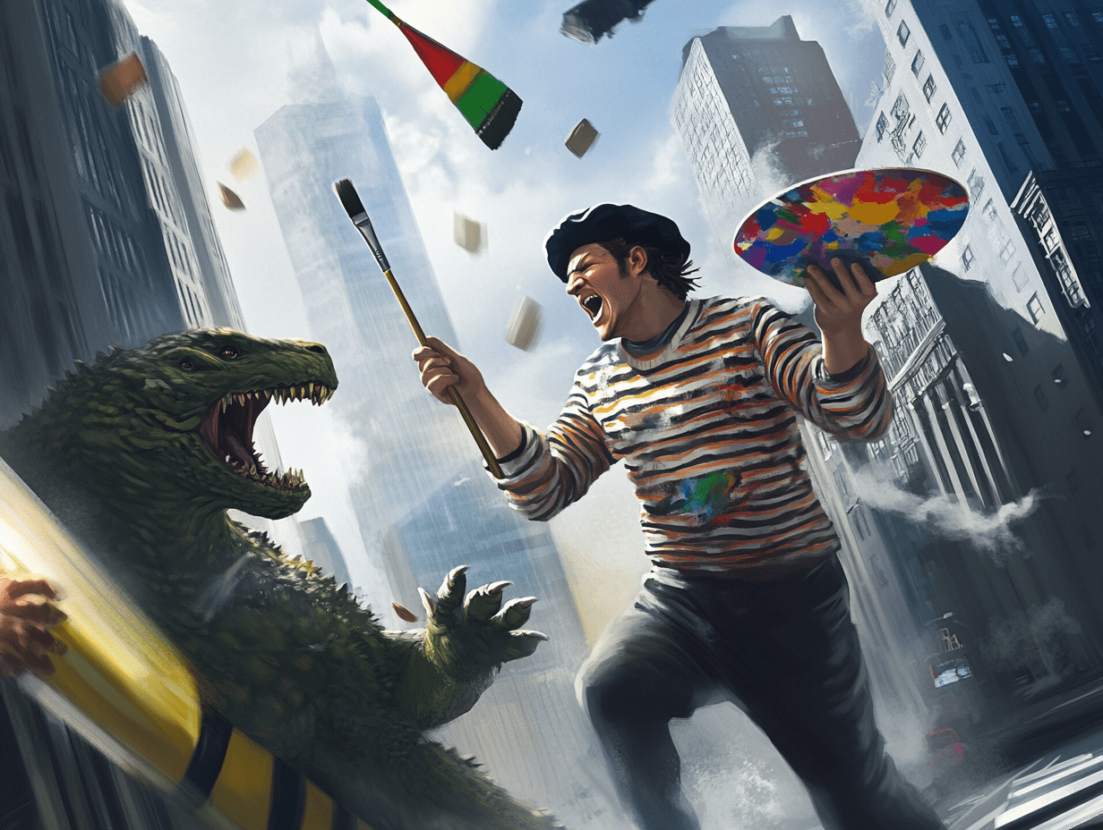Immagine di copertina: Luca Rossi, Pittore e Godzilla, immagine creata con intelligenza artificiale