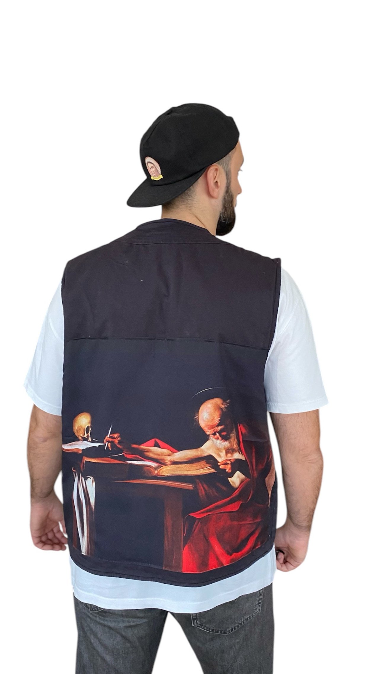 Descrizione: Gilet nero vintage personalizzato con il “San Girolamo scrivente” di Caravaggio.